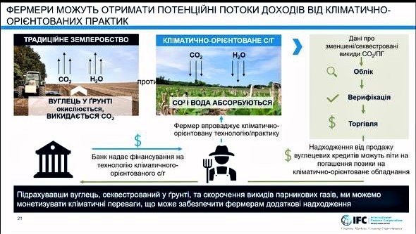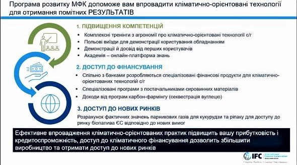 На завершення своєї доповіді спікер звернув увагу слухачів на програму розвитку Міжнародної фінансової корпорації, яка допоможе впровадити кліматично-орієнтовані технології для одержання високих економічних результатів, а саме: підвищить прибутковість, дозволить збільшити виробництво та отримати доступ до нових ринків. Порівнюючи традиційне землеробство із кліматично-орієнтованим, Володимир Нехай наголосив на економічній перевазі впровадження останнього, що проявляється у форматі додаткових грошових надходжень для фермера при скороченні парникових газів.