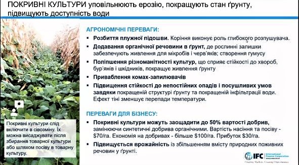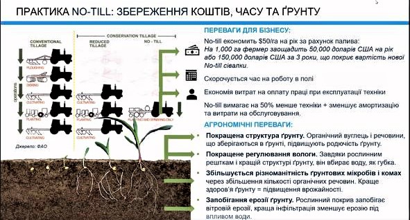 Наступна частина лекції була присвячена розкриттю міфів і узагальненню переваг щодо застосування нової технології NO-TILL - сучасної системи обробітку ґрунту, яка передбачає відмову від оранки землі за допомогою традиційної техніки. Більше того, лектор розповіі, які покривні культури слід включати в сівозміну, щоб сповільнити процес ерозії, покращити стан ґрунту та підвищити доступність води.