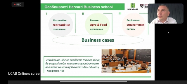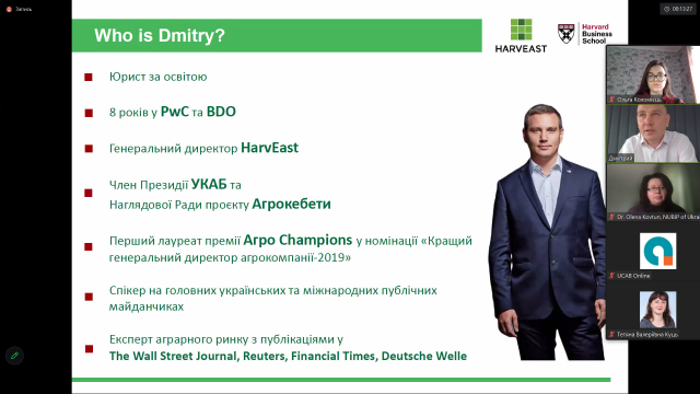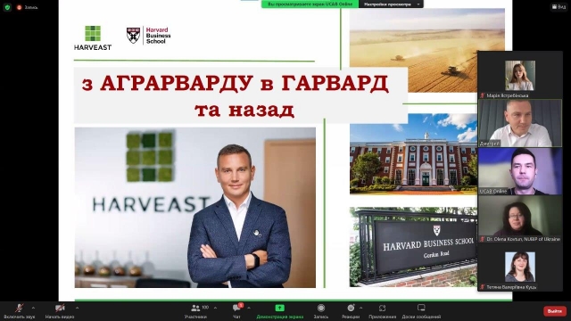 16 лютого в рамках проєкту «Агрокебети» відбулась відкрита онлайн-лекція від генерального директора HarvEast, а також члена Наглядової Ради проєкту “Агрокебети” Дмитра Скорнякова на тему: “З Аграрварду в Гарвард та назад”. В ній прийняли активну участь студенти факультету аграрного менеджменту НУБіП України, зокрема члени наукового гуртка “Основи наукових досліджень в агробізнесі”, студенти здобувачі освітнього рівня «Бакалавр» спеціальності 073 - «Менеджмент» і студенти магістратури освітніх програм : «Менеджмент ЗЕД» та «Адміністративний менеджмент».