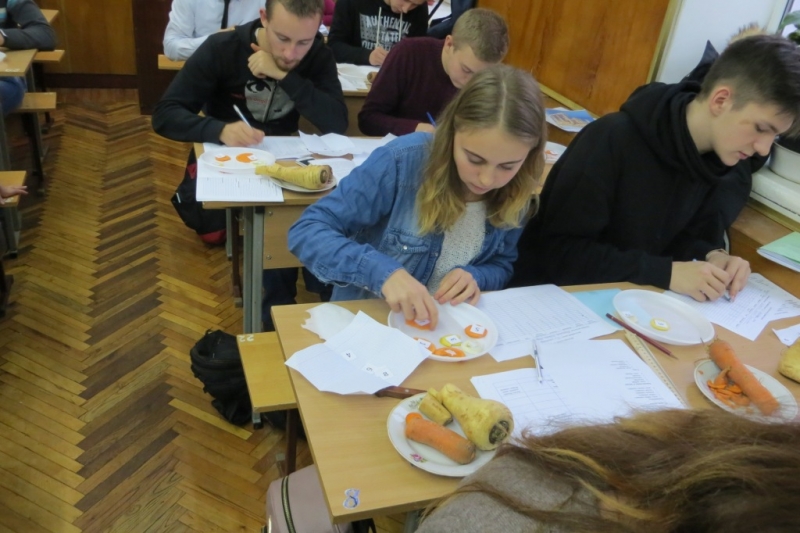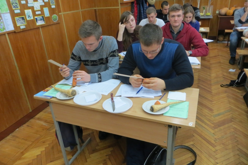 Сортове різноманіття моркви у світі дуже велике. Включає сорти різного забарвлення. Останнім часом в Україні з’являються сорти жовтої і навіть білої, фіолетової моркви. Студенти на занятті змогли переконатись, що головними у технології вирощування для культури є форма та довжина коренеплоду. З формою коренеплоду пов’язані скоростиглість, вимогливість до глибини орного шару, збирання врожаю, напрям споживання. На форму коренеплоду сильно впливають умови вирощування. На важких глинистих ґрунтах, які швидко ущільнюються, а також на погано оброблених з неглибоким орним шаром коренеплоди мають тенденцію до загострення і видовження.