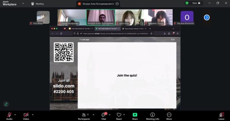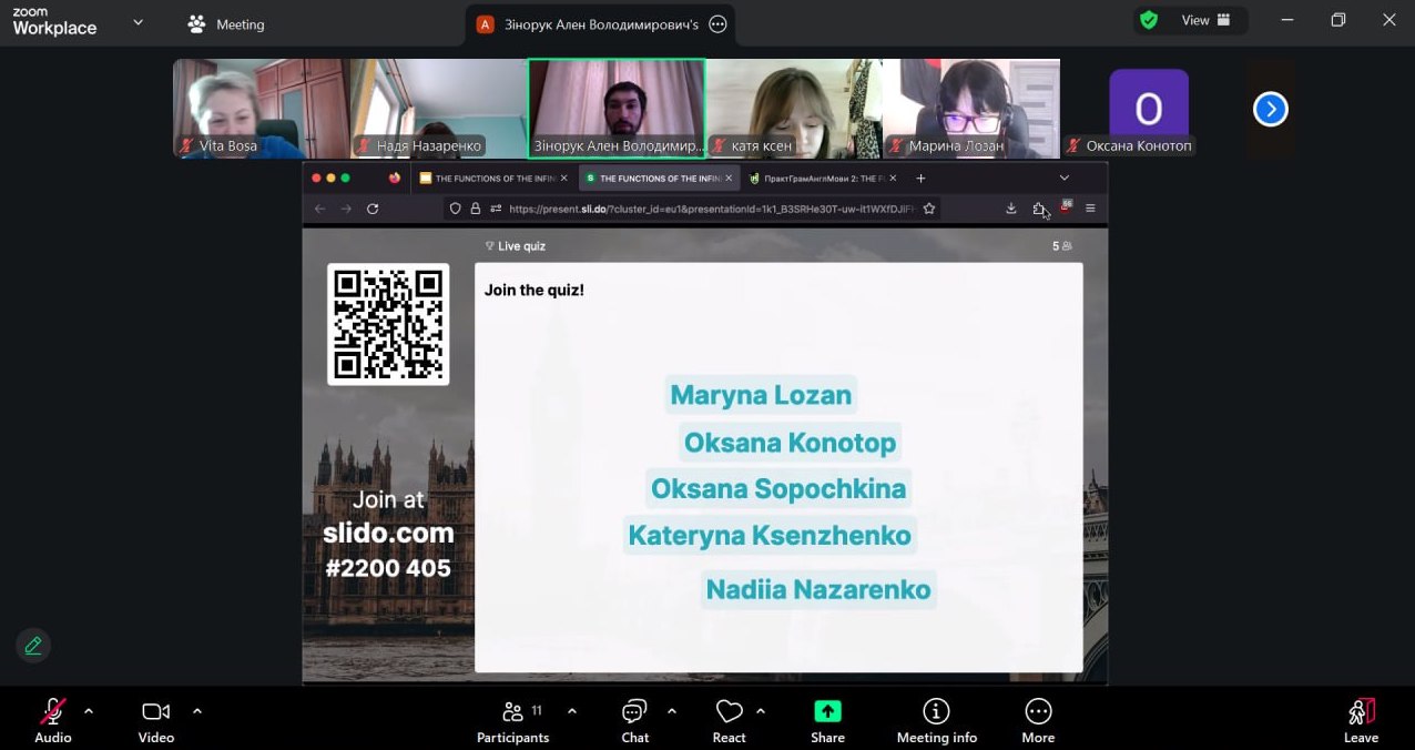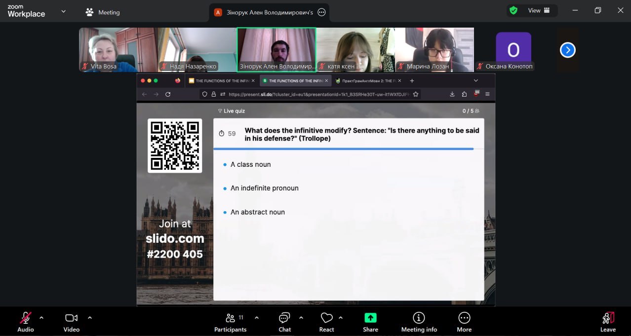 Методично заняття поєднувало пояснювально-аналітичний і проблемно-пошуковий підходи з елементами інтерактивного навчання. Важливою складовою став безперервний моніторинг навчальної діяльності, реалізований через поєднання функціоналу платформ E-learn та Slido. У режимі реального часу студенти брали участь у миттєвій ідентифікації функцій інфінітива (Attribute vs Adverbial Modifier) в автентичних реченнях та долучалися до голосування за правильне тлумачення інфінітива-означення після порядкових числівників і прикметника the last. Ключовим інструментом виступив дистрибутивний аналіз, що дозволив аргументовано розмежувати функції інфінітива.