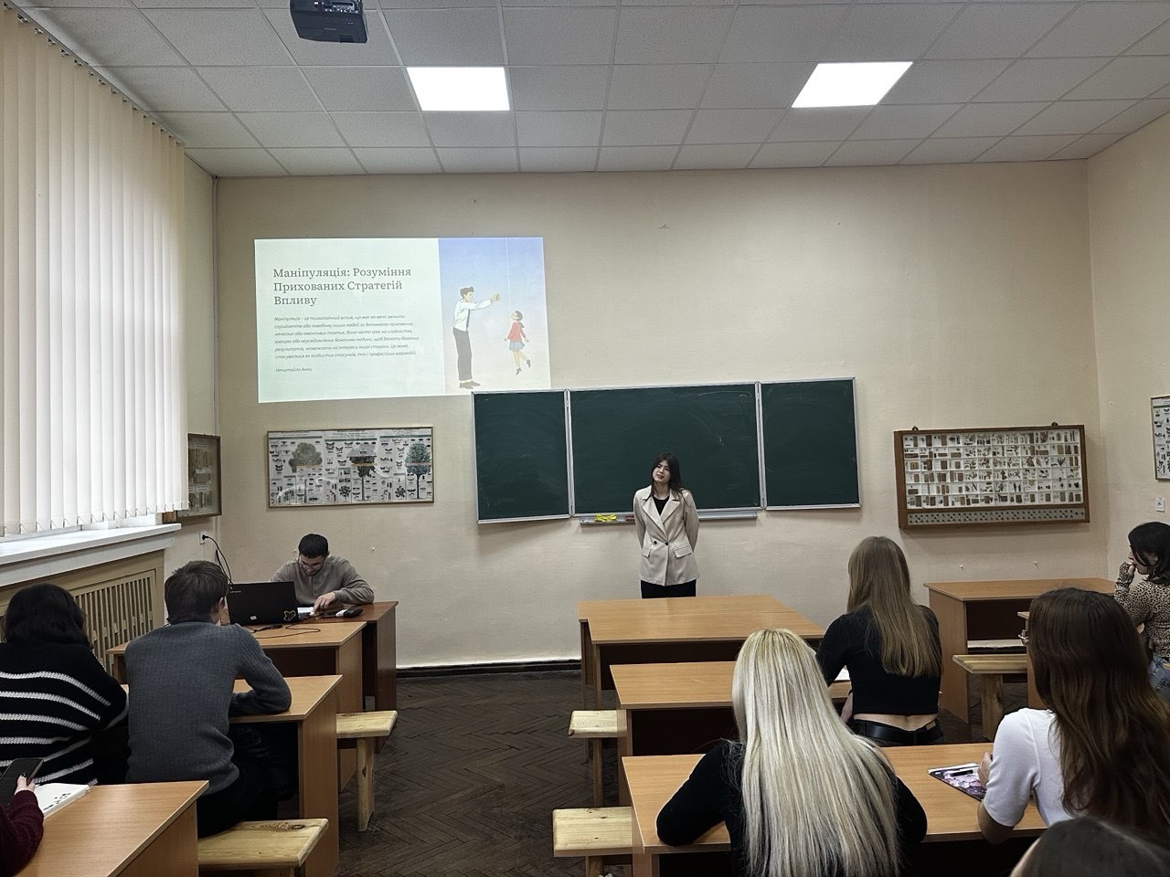 Студенти активно долучалися до роботи, виконували діагностичні завдання, дискутували щодо проявів маніпуляцій у сучасному інформаційному просторі. Атмосфера заняття була динамічною, доброзичливою та спрямованою на розвиток практичних навичок критичного мислення.
