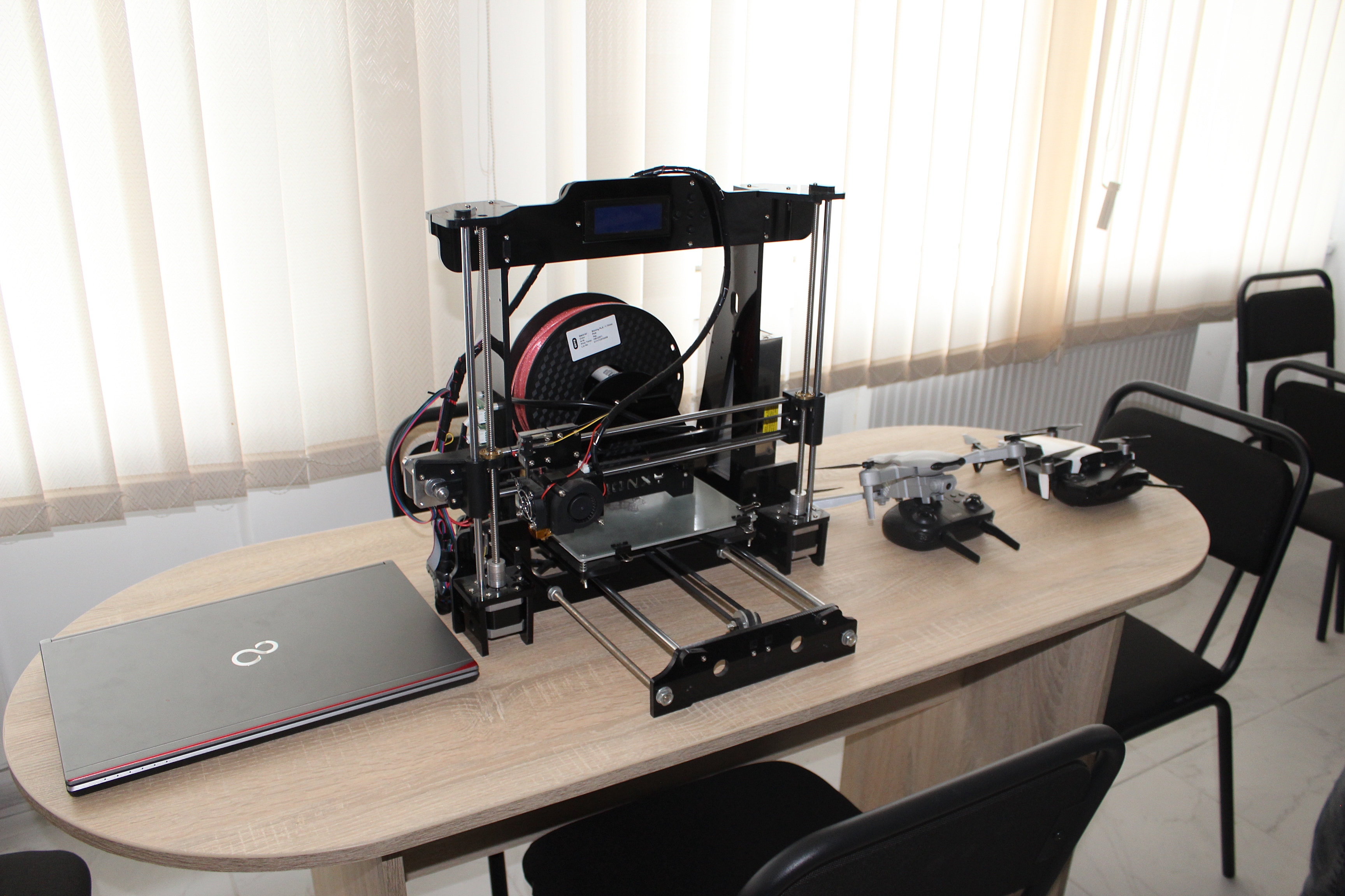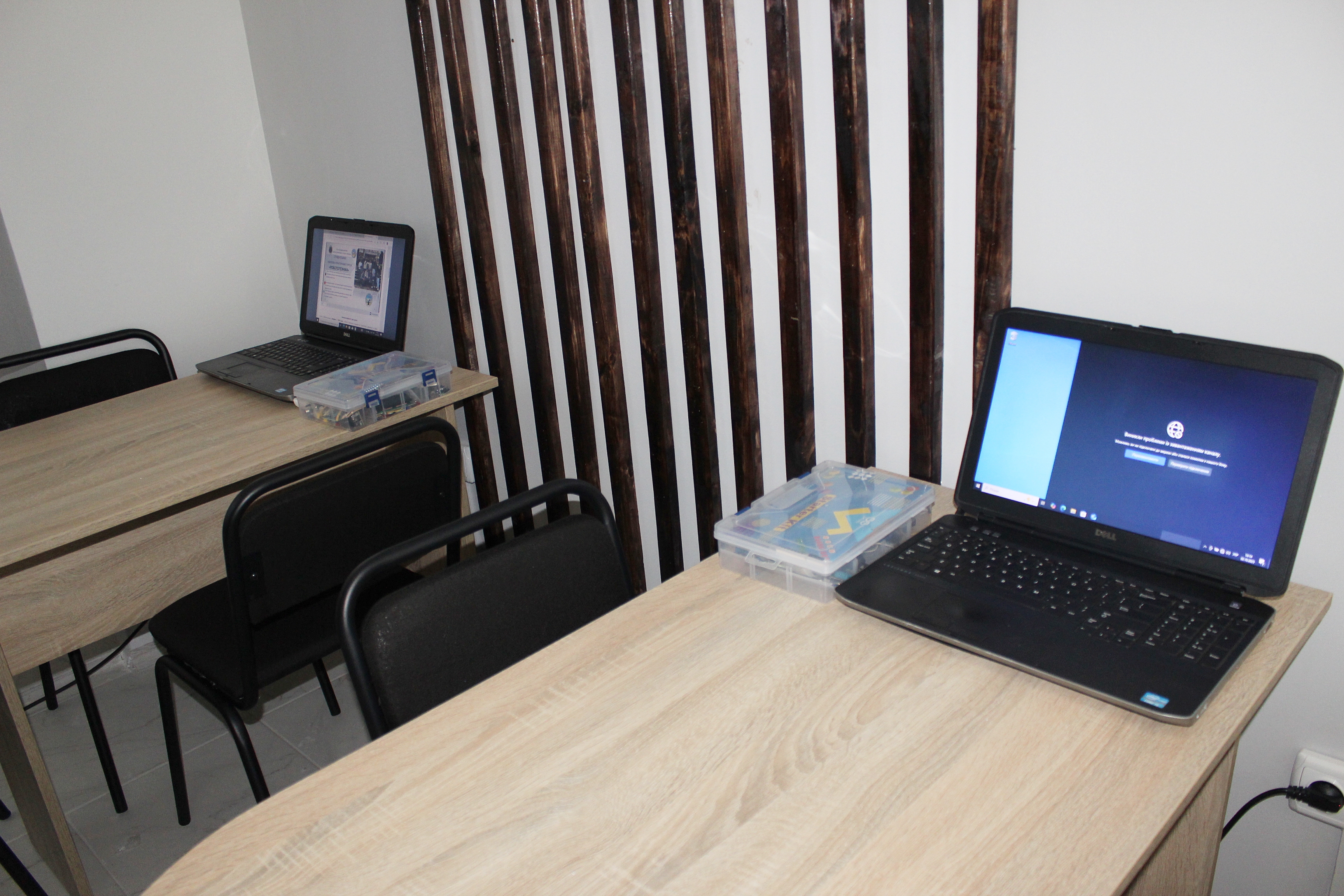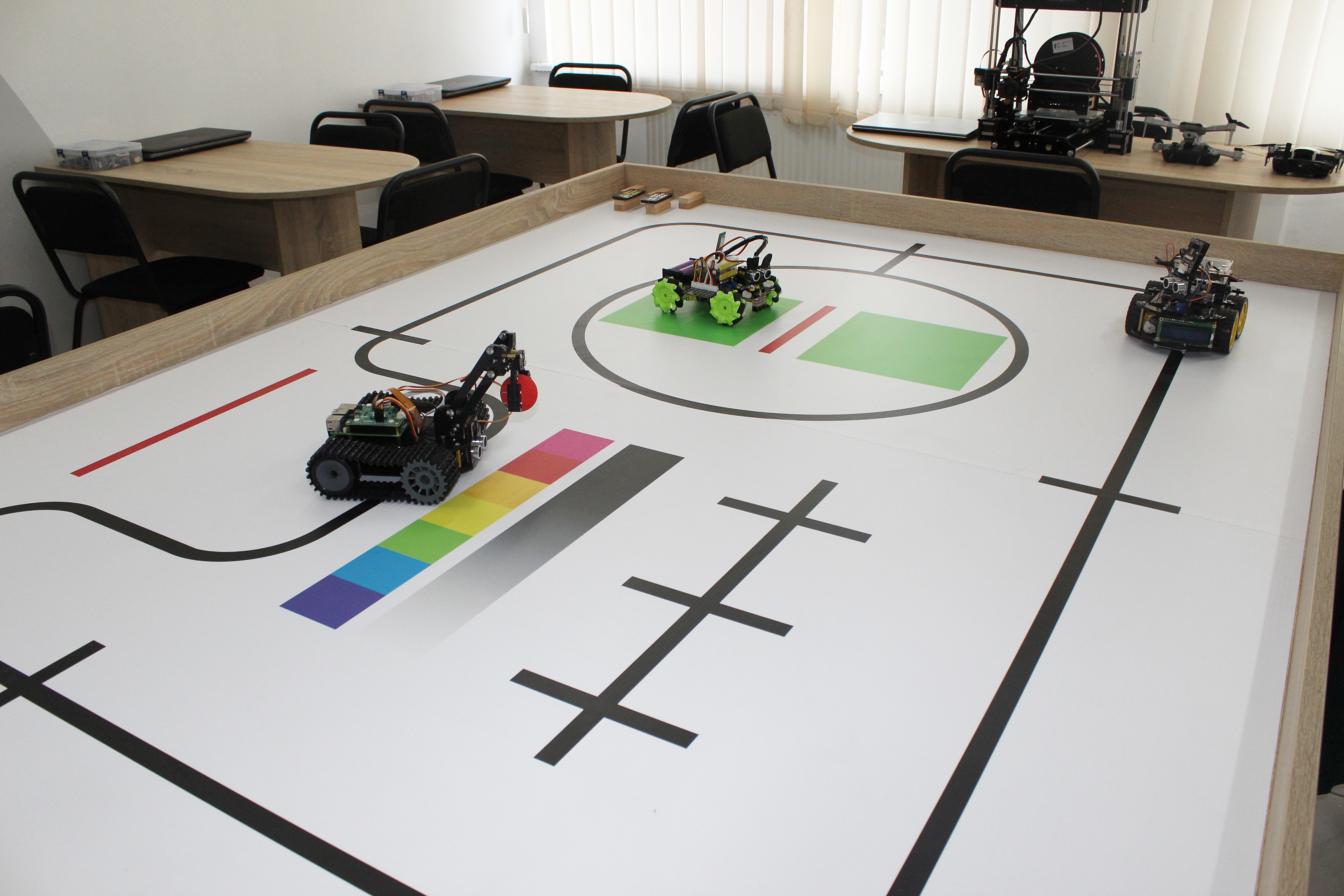 Лабораторія обладнана всім необхідним для вивчення основ електроніки, програмування та автоматизації. Серед оснащення — набори Arduino Starter Kit,комплекти робототехнічних машинок на базі Arduino та Raspberry pi 5, дрони навчального призначення для опанування основ аеродинаміки, радіокерування та сенсорних систем, а також 3D-принтер, що дозволяє створювати власні корпуси, деталі та елементи для навчальних проєктів. Крім цього, лабораторія містить сучасні ноутбуки для розробки програмного забезпечення, моделювання та тестування роботів.