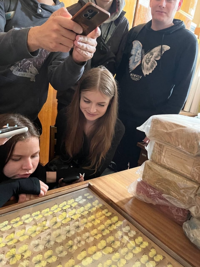 Завідувач лабораторії наукових фондових колекцій відділу ентомології та наукових фондових колекцій Андрій Ігорович Бабицький ознайомив студентів із підрозділами інституту та їхньою роботою, розповів про збір, збереження фондових колекцій і перспективи їхнього розвитку, а також продемонстрував декілька коробок з екземплярами рідкісних метеликів.