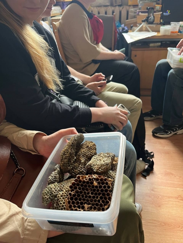 Окрім того, студенти прослухали лекцію Віктора Миколайовича Фурсова про корисних, паразитичних, рослиноїдних і хижих перетинчастокрилих комах, а також різних шкідників. Зокрема вони дізнались багато цікавого про шершнів, мегасколій, полістів, джмелів, жука кукурудзяного довгоносика, хлібного точильника, харчову моль або південну комірну вогнівку, жука квасолеву зернівку, азіатське сонечко, горіхотворку, паразитичних наїзників Мегариса, трихограму, габробракона, паразитів яєць трипсів і ознайомились з усіма цими організмами на колекційному матеріалі.