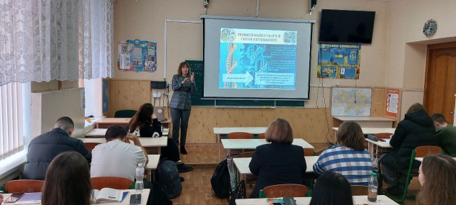 Юлія Коломієць підготувала презентацію, де познайомила учнів із широким вибором спеціальностей, перевагами навчання на факультеті та в університеті. Підкреслила можливості для розвитку й перспективи майбутньої професії, що особливо потрібні при нинішній ситуації в країні. Юлія Василівна на простих прикладах розповіла, чим займаються фахівці, яких готує факультет, на яких посадах та в яких компаніях й лабораторіях працюють. Також, вона розповіла про сучасні лабораторії, де студенти виконують практичні та лабораторні, готують дослідження для дипломних робіт. Юлія Коломієць наголосила, що факультет активно співпрацює з Радою роботодавців, аби студенти, аспіранти та випускники факультету проходили практику і стажування в престижних компаніях. Разом з тим, декан факультету розповіла про цікаве, насичене студентське життя на факультеті, яке проходить в унікальному студмістечку НУБіП України.