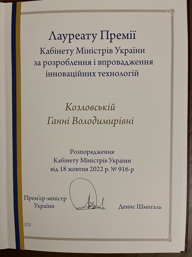 30 грудня 2022 року в Міністерстві освіти і науки України відбулось нагородження лауреатів Премії Кабінету Міністрів України, присуджених за розроблення і впровадження у виробництво інноваційних технологій. Вручаючи дипломи, міністр освіти і науки України Сергій Шкарлет відзначив високий рівень наукових здобутків вітчизняних дослідників. «Нині наука переживає нелегкі часи. Однак, незважаючи на складнощі, завдяки кропіткій праці наших вчених головні досягнення української науки ще попереду» - наголосив Сергій Шкарлет.