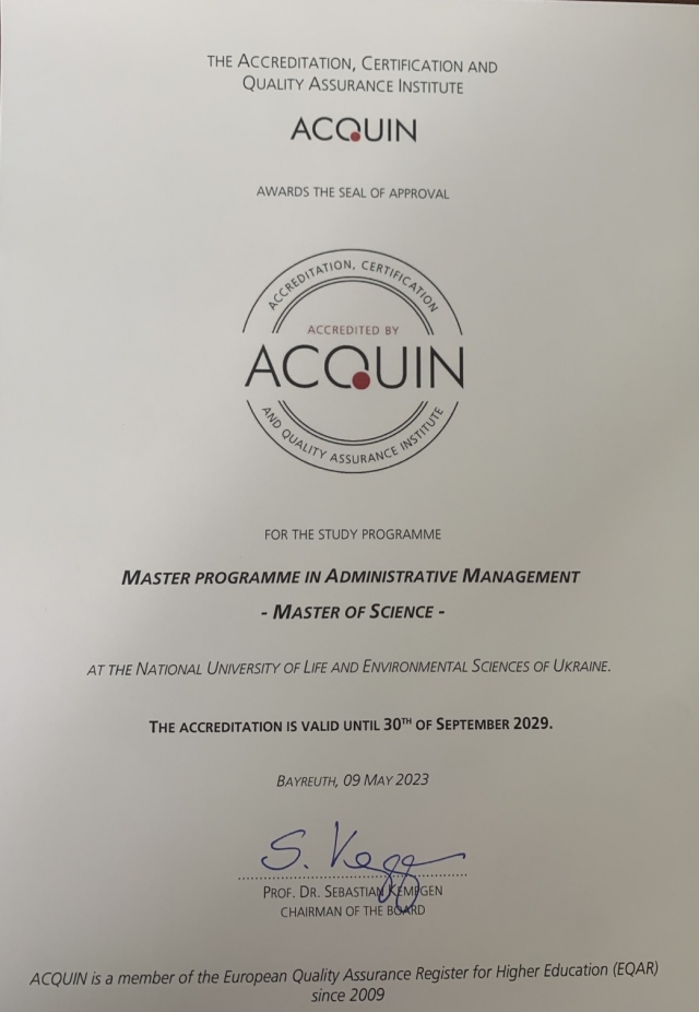 24 липня 2023 року Національний університет біоресурсів і природокористування України отримав оригінал Сертифікату про Міжнародну акредитацію Інститутом акредитації, сертифікації та забезпечення якості Accreditation, Certification and Quality Assurance Institute – ACQUIN (Німеччина) Освітньої програми "Адміністративний менеджмент" (сертифікаційний орган ACQUIN є членом Європейської кваліфікаційної агенції гарантії якості EQAR).