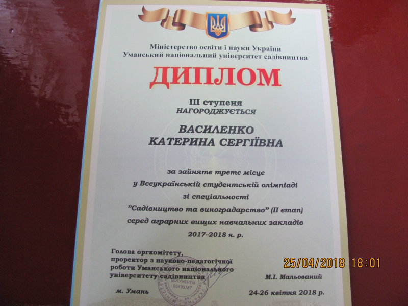 Вітаємо Катерину Василенко з перемогою в ІІ етапі Всеукраїнської студентської олімпіади зі спеціальності «Садівництво і виноградарство»