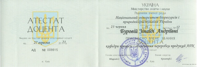 Наказом Міністерства освіти і науки України від 27.09.2021 №1017 «Про затвердження рішень Атестаційної колегії Міністерства освіти і науки України щодо присвоєння вчених звань і присудження наукових ступенів з присвоєнням вченого звання доцента» нашим колегам – Буровій Зінаїді Андріївні, Голембовській Наталії Володимирівні, Менчинській Аліні Анатоліївні та Іванюті Анастасії Олександрівні присвоєні вчені звання доцента.
