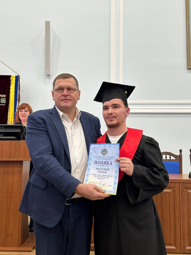 Олексій Сергієнко, батько нашого випускника заявив, що горжуся, адже його син став на одну сходинку вище нього - отримав диплом з відзнакою. Зазначив, що лише знання і повага до вчителів, до колег, до агрономів дасть випускникам можливість отримувати високу заробітню плату. "Ви повинні бути класними фахівцями і тоді досягнете успіху. Пам'ятаю всіх тих, хто вклав в мене основи науки. Цінуйте закони природи! На них тримається вся земля. Цінуйте свою державу! Ніколи не бійтеся підніматися. Ви часто падатиме, це запорука успіху, але завжди підіймайтеся. В щасливу дорогу!"