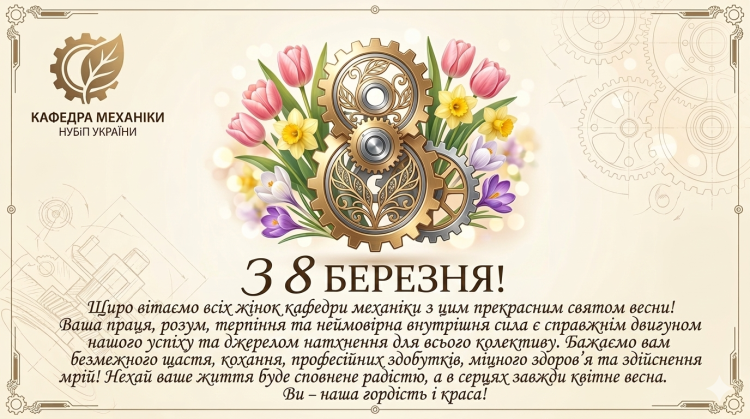 ВІТАЄМО НАШИХ ЧАРІВНИХ КОЛЕЖАНОК ЗІ СВЯТОМ 8 БЕРЕЗНЯ! ЧОЛОВІЧИЙ КОЛЕКТИВ КАФЕДРИ МЕХАНІКИ! нд, 8 бер 2026 - 07:42