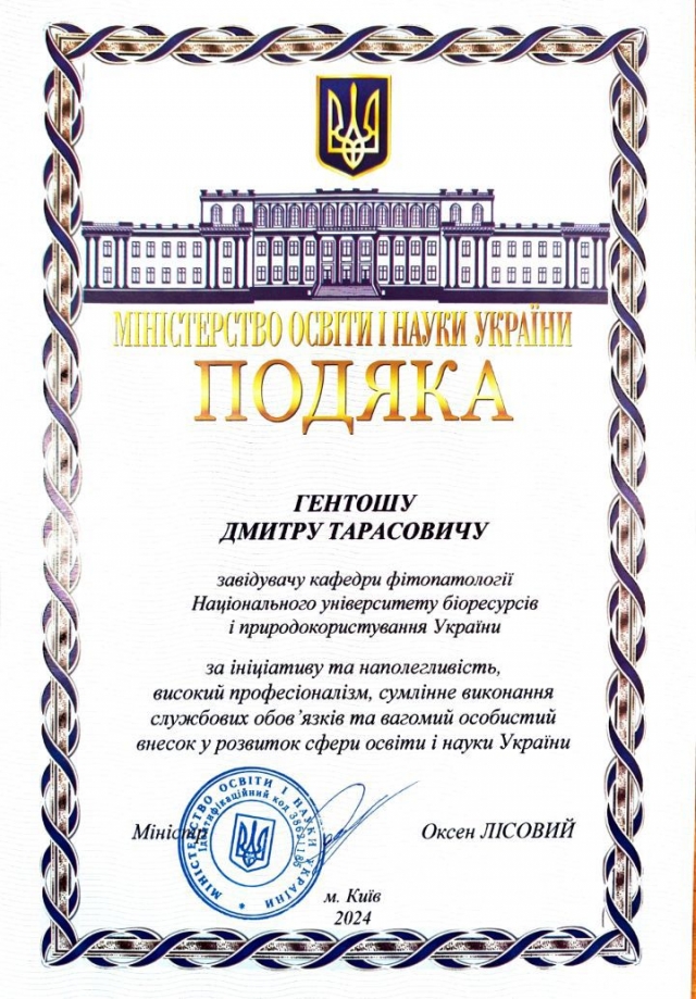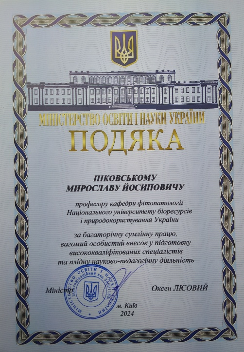 Вітаємо НПП кафедри фітопатології ім. акад. В.Ф. Пересипкіна, що відзначені подяками Міністерства освіти і науки України!
