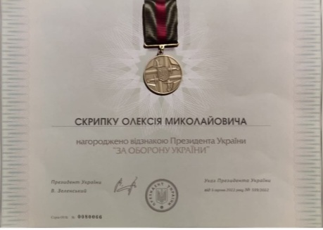 За особисту мужність і самовідданість, проявлені під час захисту державного суверенітету та територіальної цілісності України в умовах воєнного стану, високу патріотичну свідомість і відданість військовій присязі нагороджено, Олексія СКРИПКУ, відзнакою «За оборону України».