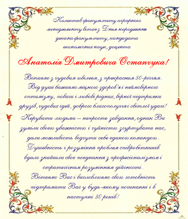 Вітаємо з 50-річчям Анатолія Дмитровича ОСТАПЧУКА!
