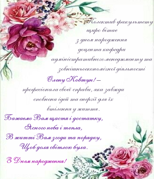 Вітаємо з Днем народження керівника міжнародних програм ФАМ, доцента Олену КОВТУН! Адміністрація факультету сб, 27 жов 2018 - 03:00