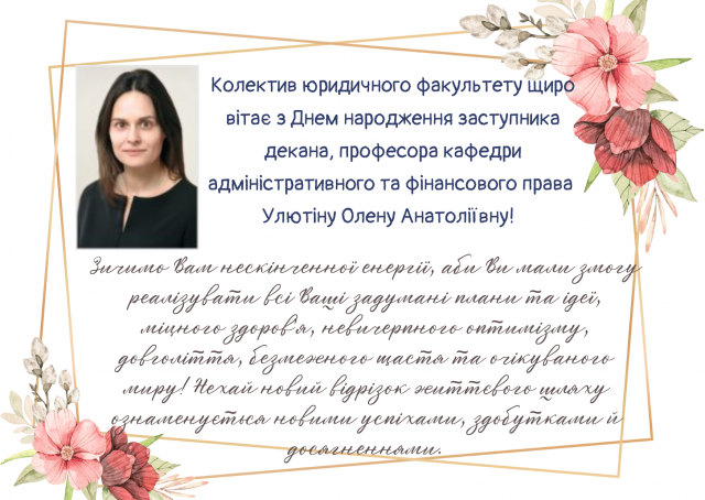 Вітаємо з Днем народження Олену Анатоліївну Улютіну! Адміністрація юридичного факультету, аспіранти та студенти ср, 6 бер 2024 - 02:00
