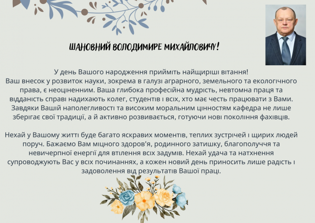Адміністрація юридичного факультету, колеги, аспіранти та здобувачі щиро вітають з Днем народження завідувача кафедри аграрного, земельного та екологічного права ім. академіка В. З. Янчука, доктора юридичних наук, професора, члена-кореспондента Національної академії правових наук України