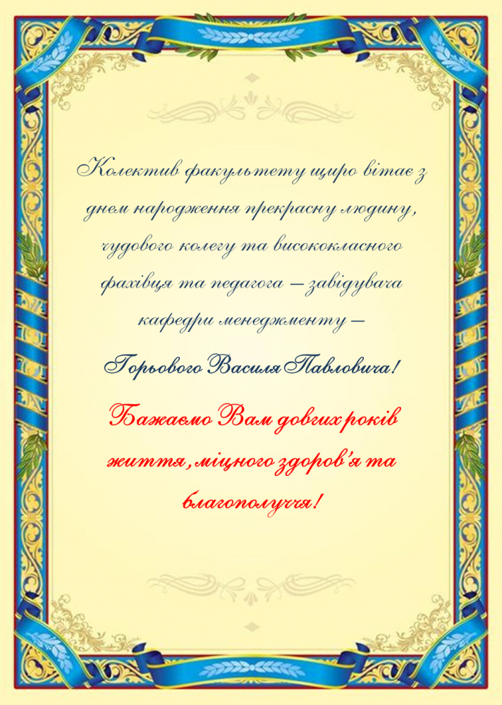 Вітаємо з днем народження завідувача кафедри менеджменту ім. професора Й.С. Завадського – ГОРЬОВОГО Василя Павловича! Адміністрація факультету сб, 20 кві 2019 - 03:00