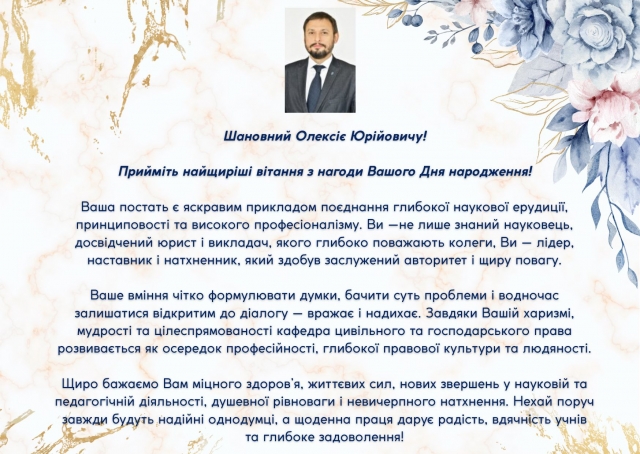 Вітаємо з Днем народження завідувача кафедри цивільного та господарського права Олексія Піддубного! З найкращими побажаннями адміністрація юридичного факультету пт, 23 тра 2025 - 03:00