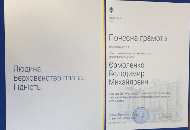 Вітаємо з нагородженням Почесною Грамотою та відзнакою Верховного Суду Єрмоленка Володимира Михайловича!