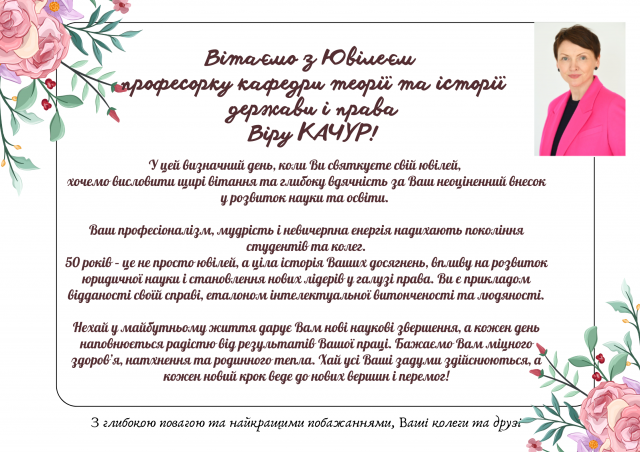 Вітаємо з Ювілеєм професорку кафедри теорії та історії держави і права Віру Качур! пт, 6 вер 2024 - 03:00