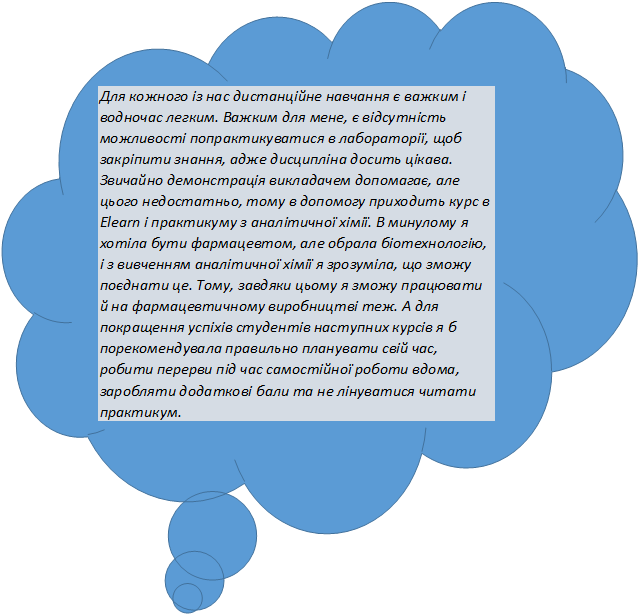 Розпочнемо розмову з минулого семестру, навчання у якому майже повністю було дистанційним, а загальну думку про його ефективність вдало, на наш погляд, під час опитування висловила студентка 2 курсу з майбутніх біотехнологів Климчук Анна:
