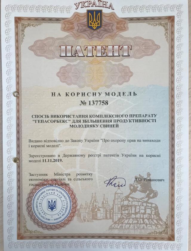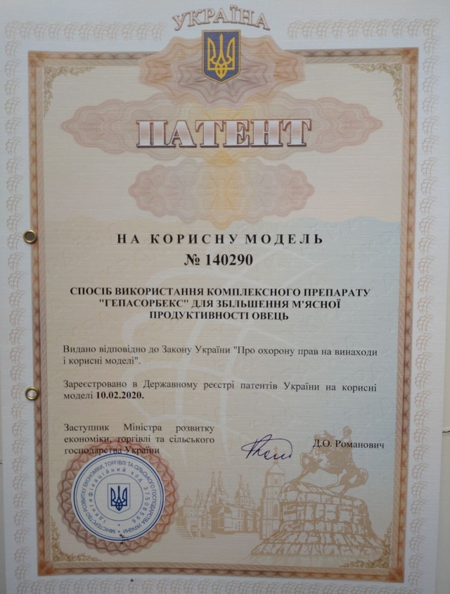 Дослідження щодо визначення ефективності використання науково-виробничої розробки («Гепасорбекс») були проведенні в умовах господарств-партнерів з виробництва продукції свинарства, вівчарства та птахівництва і навчально-науково-виробничих лабораторіях кафедри. Доведено, що для збільшення продуктивності тварин та птиці, профілактики шлунково-кишкових захворювань, підвищення природної резистентності відгодівельного молодняку та збільшення ефективності, рентабельності виробництва продукції в умовах промислових комплексів, фермерських господарств рекомендується до складу повнораціонних комбікормів вводити комплексний препарат, сорбент мікотоксинів «Гепасорбекс» у вказаних пропорціях (0,5-3,0 кг на тону) залежно від контамінації кормів. Вищі показники продуктивності, швидкість росту зумовлюють зменшення витрат дороговартісних комбікормів. Використання вказаного комплексного препарату достовірно підвищує показники м’ясної продуктивності тварин та птиці.