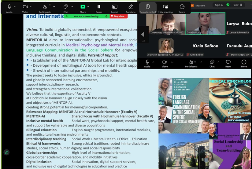 Лютий 2026 видався знаменним для кафедри соціальної роботи та реабілітації Гуманітарно-педагогічного факультету Національного Університету Біоресурсів та Природокористування України рядом зустрічей з представниками Університету прикладних наук Hochschule Hannover керівництвом з міжнародної співпраці Професором доктором Кордулою фон Денковскі та Наталі Лекс, міжнародним координатором. Відзначимо, що дана співпраця матиме продовження в березні в очному форматі: керівництво Факультету V – діаконічні дослідження, охорона здоров'я та соціальна робота запросило Супрун Дар’ю Миколаївну, доктора педагогічних наук, професора, професора кафедри соціальної роботи та реабілітації, до продовження діалогу в Університеті в Hannoverі.