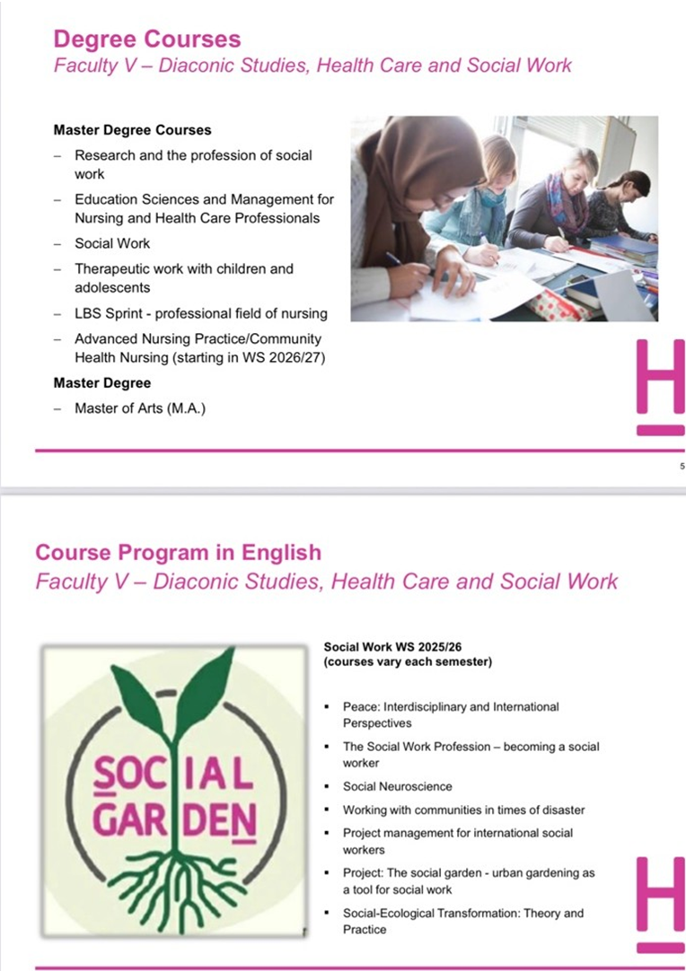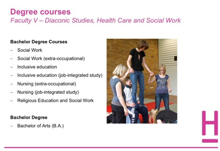 Факультет V – Дияконічні студії, охорона здоров'я та соціальна робота пропонує шість програм бакалаврату та три програми магістратури, кожні з яких мають тісний зв'язок між теорією та практикою та маніфестують міждисциплінарний підхід. Факультет V також тісно співпрацює з церквами, благодійними організаціями, організаціями соціальної економіки, місцевими органами влади, лікарнями та закладами догляду. Як результат, навчання за всіма програмами навчання орієнтоване на практичний попит. Дослідницька діяльність, а також міжнародна співпраця збагачують процес викладання та навчання.