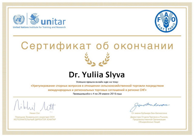 З 4.04.2016 року по 29.04.2016 року ФАО і ЮНІТАР організували навчальні курси на тему: "Врегулювання спірних питань щодо сільськогосподарської торгівлі в рамках міжнародних і регіональних торговельних угод в країнах СНД" .