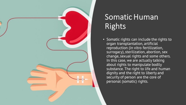 Сьогодні в юридичній науці, яка постійно розвивається, виділяють нове покоління прав – соматичні права (від грец. soma – тіло) – група прав особи щодо самостійного розпорядження своїм тілом (в т. ч. права у сфері трансплантології).