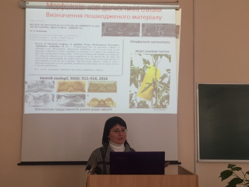 Про результати участі у міжнародних конференціях “Ecology of Aphidophaga” (Німеччина, 2016) та “Інтегрований захист рослин у закритому ґрунті, Помірний клімат” (Канада, 2017) доповіла молодший науковий співробітник відділу систематики ентомофагів та екологічних основ біометоду Інституту зоології ім. І.І. Шмальгаузена НАН України, к.б.н. Марина Олександрівна Калюжна (https://youtu.be/vENXlARIi0M).