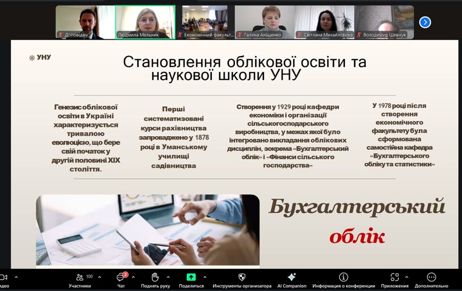 Завідувач кафедри обліку та оподаткування НУБіП України Володимир ЛИТВИНЕНКО наголосив на важливості інтеграції історичного досвіду підготовки фахівців у сучасні програми освіти, а професор Людмила МЕЛЬНИК, завідувач кафедри обліку і оподаткування Уманського національного університету, доктор економічних наук, професор представила аналітичний огляд внеску українських науковців у розвиток теорії бухгалтерського обліку.