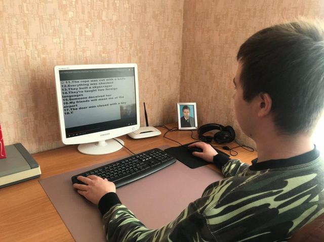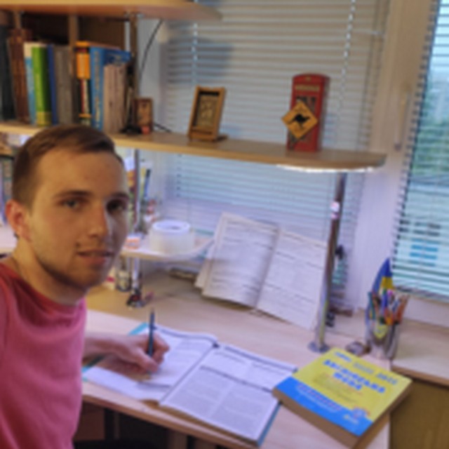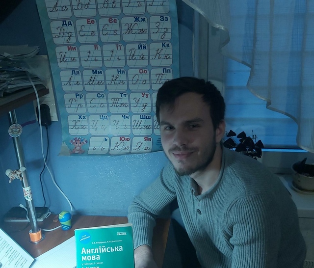 Танцюрист Влад Корнієнко для підготовки до єдиного вступного іспиту з іноземної мови працює з репетитором і вся його робоча обстановка зосереджена в таблицях і схемах, алфавіті з англійської мови. Можна як поспівчувати, так і позаздрити такому бажанню вчитися!