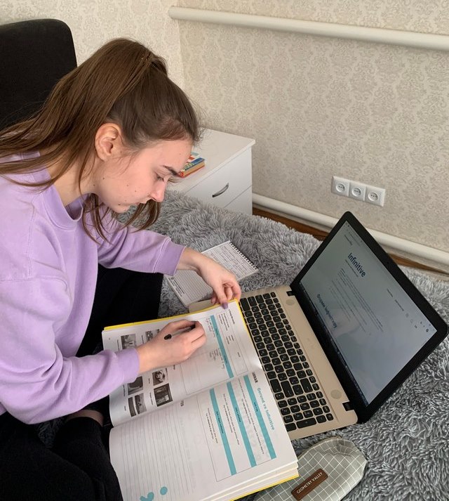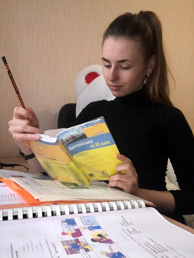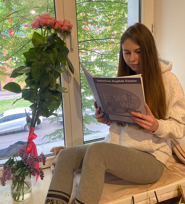 А студенти не розгубилися, вони працюють і дуже багато часу зараз іде на підготовку до цих заходів. Так, не збавляють обертів наші студенти, особливо над удосконаленням своїх знань з іноземної мови. Каті Мусієнко, приміром, до вподоби працювати на підвіконні поряд з чудовими трояндами, запах яких заворожує не менше, як повторення матеріалу з англійської мови.