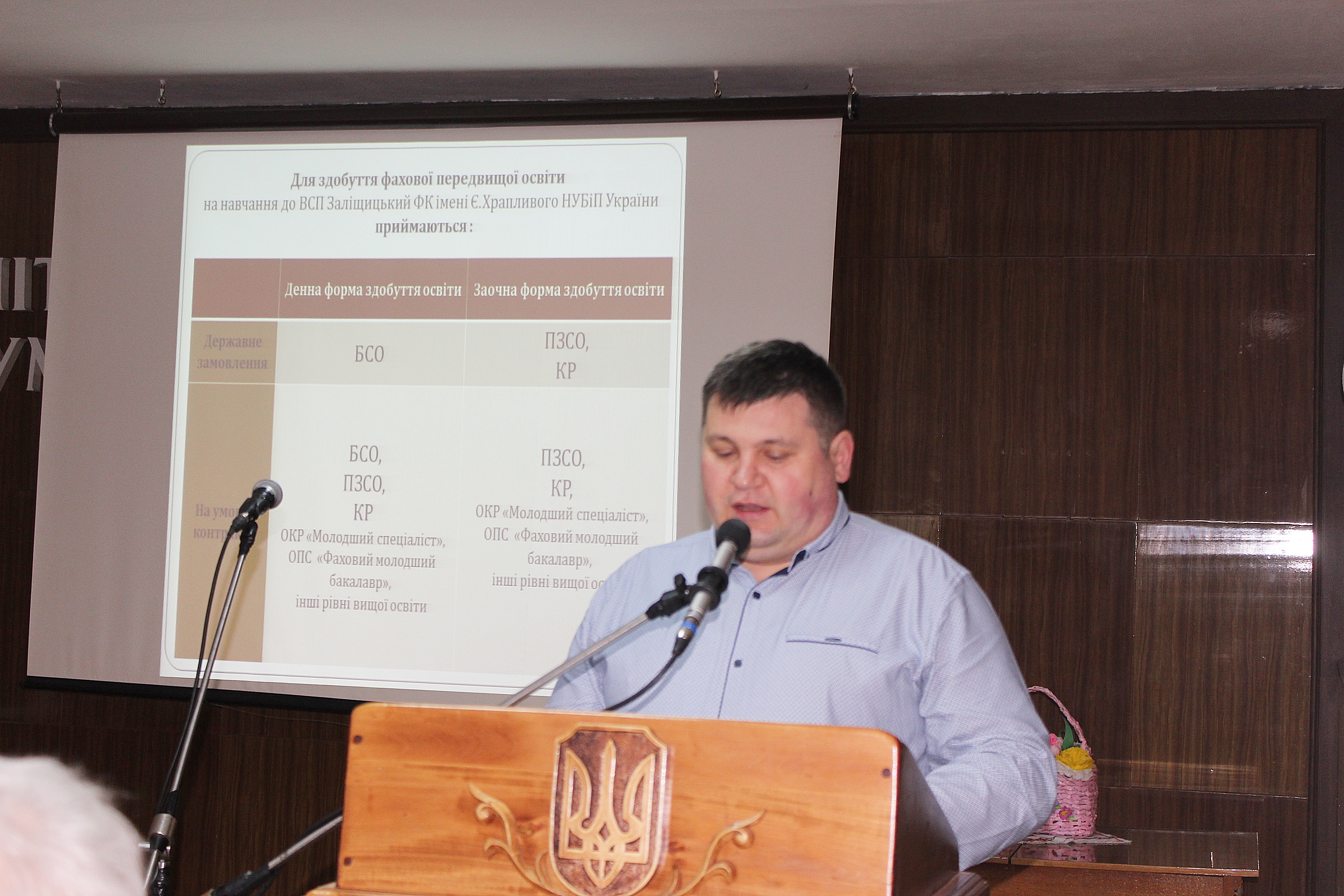 Щиро вітав присутніх Борис ПАВЛЮК, директор навчального закладу. У своєму виступі Борис Степанович відзначив, що навчальний заклад, який є одним з найстаріших та найвідоміших в регіоні, входить в структуру Національного університету біоресурсів та природокористування України. Випускники Заліщицького фахового коледжу відомі не тільки в регіоні, але й далеко за його межами. Отримання фахової підготовки в коледжі дає можливість стати успішними у професійній діяльності. Борис Степанович запросив потенційних абітурієнтів на навчання та висловив сподівання, що більшість учасників Дня відкритих дверей стануть студентами нашого фахового коледжу.