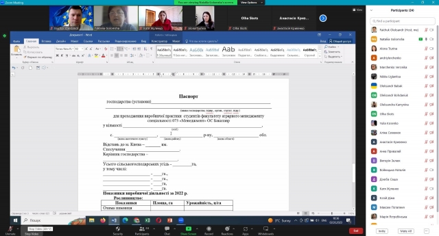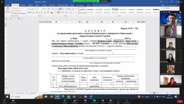 02 березня 2023 р., в рамках кураторських годин, доценти кафедри адміністративного менеджменту та ЗЕД Альона Тюріна та Олександр Файчук організували для студентів третього року навчання вступний інструктаж щодо проходження виробничої практики. Відчуваючи гостру потребу у детальному роз’ясненні формальних аспектів, академічні наставники запросили виступити відповідальну особу за проведення практики на кафедрі – доцента Наталію Голомшу. Остання звернула увагу слухачів на правильність оформлення договору на проведення практики студентів НУБіП України, а також паспорту господарства (установи), що має виступити базою виробничого навчання. Разом із тим, вона наголосила на термінах, місці та алгоритмі його проходження. Варто зазначити, що у студентів виникало багато запитань, на які Наталія Голомша дала кваліфіковані й вичерпні відповіді.