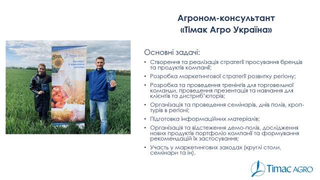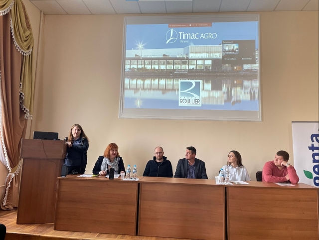 Розпочала хвилюючу зустріч роботодавців зі студентами декан агробіологічного факультету Оксана Тонха. Вона звернула увагу на актуальність проведення подібних заходів. Коротко розповіла представникам компаній про перспективних та заповзятих молодих фахівців. Також зауважила, що наші студенти навчаються за двома спеціальностями 201 «Агрономія» та 203 «Садівництво, плодоовочівництво та виноградарство». В рамках цих спеціальностей студенти також мають можливість обрати окремий напрямок, а студенти ОС «Магістр» – одну з освітніх програм: «Агрономія», «Агрохімія і грунтознавство», «Агрохімсервіс у прецизійному агровиробництві», «Селекція і генетика сільськогосподарських культур» та «Садівництво та виноградарство». Координацію "Ярмарку професій" проводила Лілія Галайдюк з відділу працевлаштування випускників та видачі документів про вищу освіту. А так як на зустрічі присутніми були компанії різних спрямувань, то організований Ярмарок викликав велику зацікавленість у студентів агробіологічного факультету. Наступна частина зустрічі проходила в форматі представлення присутніх компаній та жвавих дискусій зі студентами. Обговорювалися перспективи, стажування, практики, сучасні тенденції в агровиробництві та вакансії. Компанію TimacAGROUkraine представили Марія Черевко, фахівець з підбору персоналу, та Олександр Бабенко, керівник продакт-менеджерів.