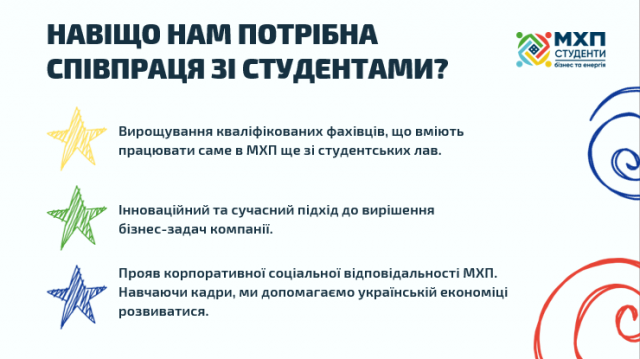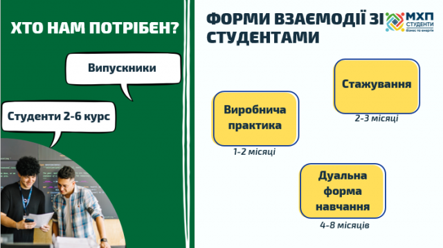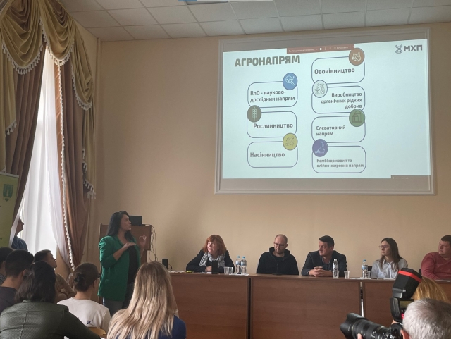 МХП представили фахівець з професійного навчання Шептицька Марина та провідний фахівець з підбору та адаптації персоналу (напрям агрономія) Домненко Ірина. Вони розповіли про можливість дуального навчання – тобто коли в процесі підготовки студента приймають участь одразу два заклади – навчальний та роботодавець.