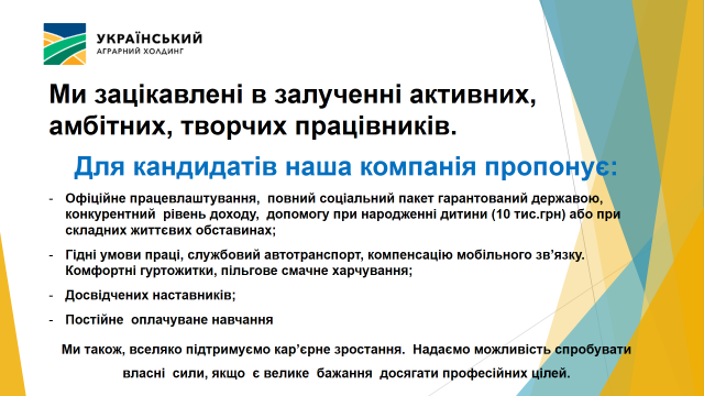 Щодо можливостей і перспектив в компанії ТОВ “Український Аграрний Холдинг” студентам розповіла Єгорченко Олена, керівник напряму підбору та адаптації персоналу.