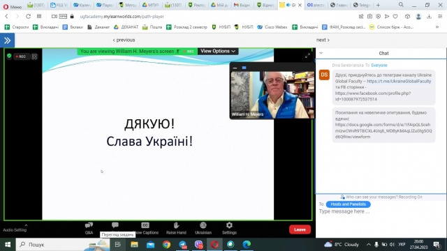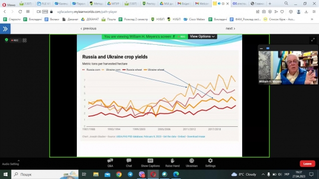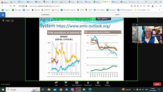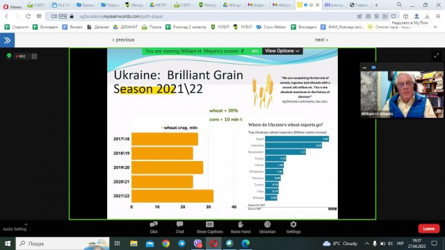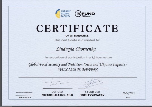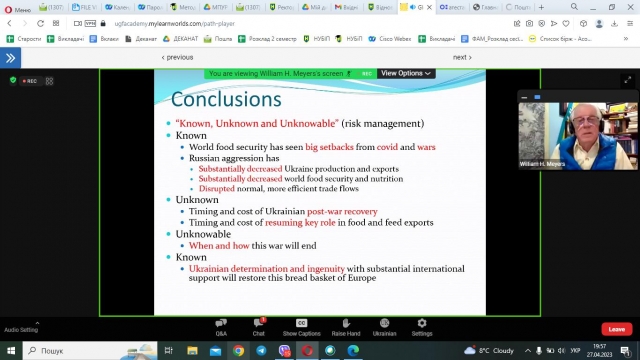 27 квітня 2023 року к.е.н., старший викладач кафедри адміністративного менеджменту та ЗЕД Людмила Чорненька відвідала онлайн-лекцію Почесного професора аграрної та прикладної економіки Науково-дослідного інституту продовольчої та аграрної політики Університету Міссурі PhD William H. Meyers «Global Food Security and Nutrition Crisis and Ukraine Impacts. Захід був організований Міжнародною освітньою платформою «Ukraine Global Faculty».