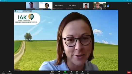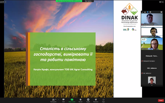 Ключовим лектором виступила консультант ТОВ IAK Agrar Consulting Катрін Крафт. У своїй доповіді лекторка проінформувала учасників про сутність дефініції «сталість», а також розкрила особливості побудови й роботи моделі оцінки сталості, що передбачає розрахунок 29 індикаторів у розрізі економічної, екологічної та соціальної сталості.