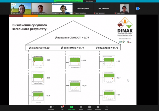 07 жовтня 2021 р. в рамках проєкту «Німецько-український агрополітичний діалог» було організовано й проведено круглий стіл в онлайн-форматі на тему : «Оцінка сталості Німецьким інститутом сталого сільського господарства (DINAK)». У заході прийняли участь 63 учасники, серед яких були к.е.н., доц. кафедри адміністративного менеджменту та ЗЕД Альона Гребеннікова та Олександр Файчук.