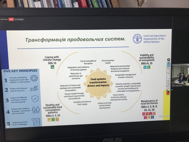 Після вітальних слів Міністра закордонних справ України Дмитра Кулеби, Міністра аграрної політики та продовольства України Романа Лещенка і заступника Міністра розвитку економіки, торгівлі та сільського господарства України - Торгового представника України Тараса Качки виступи було надано представникам вітчизняної науки та бізнесу. Зокрема, цікавим і змістовним був виступ координатора ФАО зі зв’язків з урядом та донорами в Україні Михайла Малькова на тему «Шляхи трансформації продовольчих систем України в умовах впливу кліматичних змін та кліматичної політики торговельних партнерів».