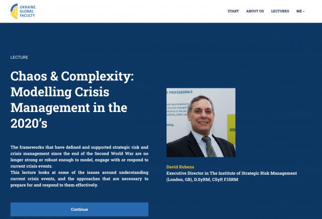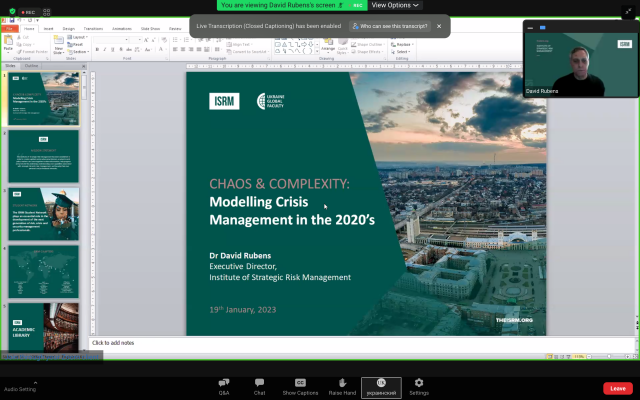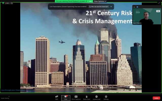 Викладачі кафедри адімінстративного менеджменту та зовнішньоекономічної діяльності долучились до першої лекції курсу з кризового менеджменту від DAVID RUBENS «Chaos & Complexity: Modelling Crisis Management in the 2020’s», що відбулась 19 січня 2023 р. Девід Рубенс є Директором Інституту управління стратегічними ризиками (Лондон, Британія).