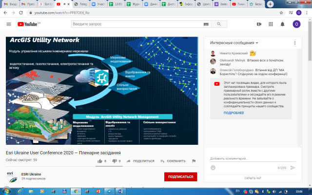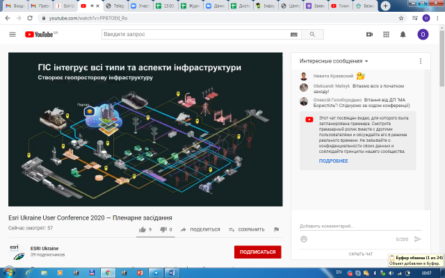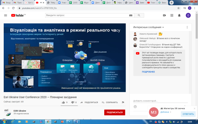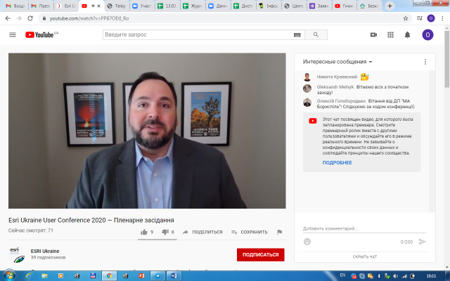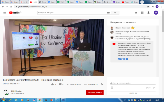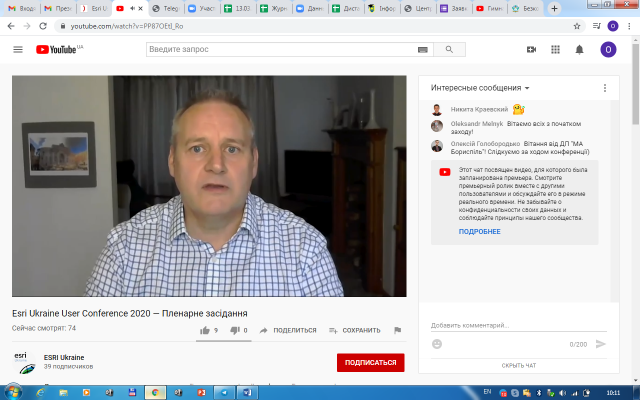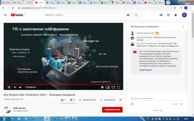 Трансляція здійснювалася на Youtube - каналі ESRI Ukraine, де транслювалося відео - спогади конференції 2019 року, окремо було надано посилання на телеграм канал, де учасники мали можливість задати питання доповідачам, та обговорити актуальні теми висвітлені у ході пленарного засідання, а окрім спілкування у телеграм учасники мали можливість підключення до конференції у Zoom, яка відбулася одразу після пленарного засідання о 16:00 - підводилися підсумки конференції та коротко розглядалися найцікавіші питання, які виникли у ході пленарного засідання.