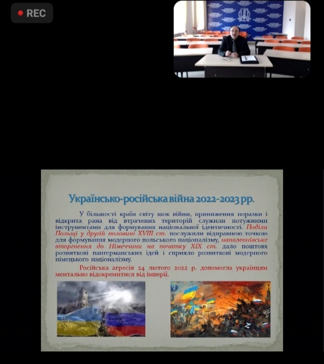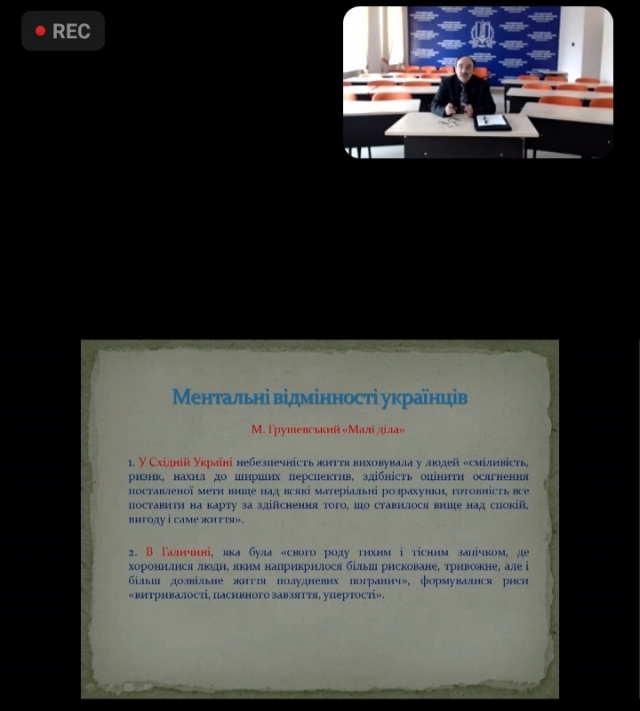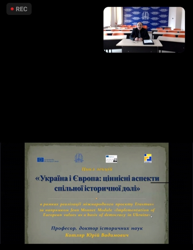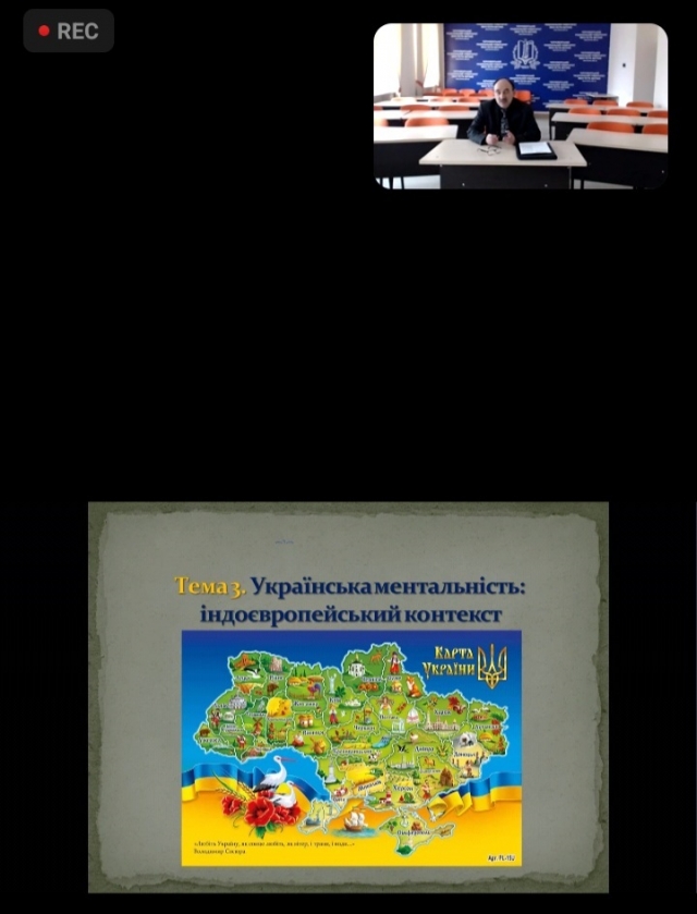 Сьогодні викладачі та аспіранти кафедри міжнародних відносин і суспільних наук дистанційно прослухали лекцію доктора історичних наук, професора Юрія Котляра із Чорноморського національного університету імені Петра Могили (м. Миколаїв) на тему «Українська ментальність: індоєвропейський контекст», що є третьою в циклі лекцій «Україна і Європа: ціннісні аспекти спільної історичної долі».