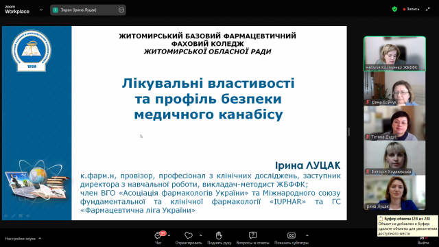 "Лікувальні властивості та профіль безпеки медичного канабісу" – Ірина Луцак, к. фарм. н., провізор, професіонал з клінічних досліджень, заступник директора з навчальної роботи, викладач-методист ЖБФФК.