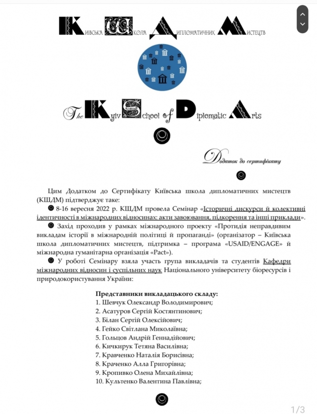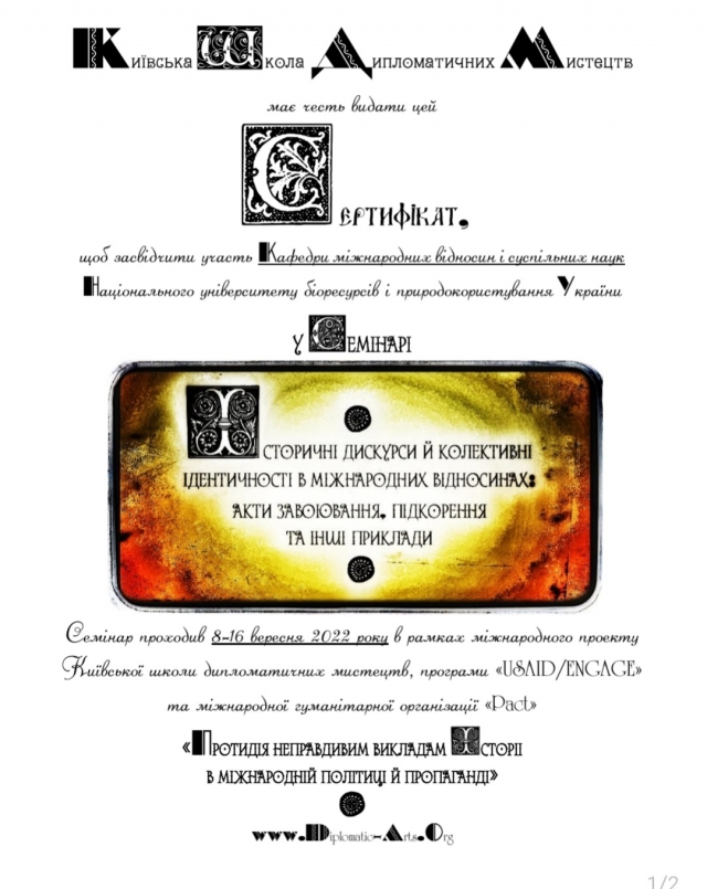 Черговим свідченням цього стала участь НПП кафедри та значної кількості студентів спеціальності «Міжнародні відносини, суспільні комунікації та регіональні студії» у Семінарі «Історичні дискурси й колективні ідентичності у міжнародних відносинах: акти завоювання, підкорення та інші приклади», що він пройшов 8-16 вересня у рамках міжнародного проекту «Протидія неправдивим викладам історії у міжнародній політиці й пропаганді» і був організований Київською школою дипломатичних мистецтв (КШДМ) за підтримки міжнародної програми «USAID/ENGAGEЯ» й міжнародної гуманітарної організації «Pact».